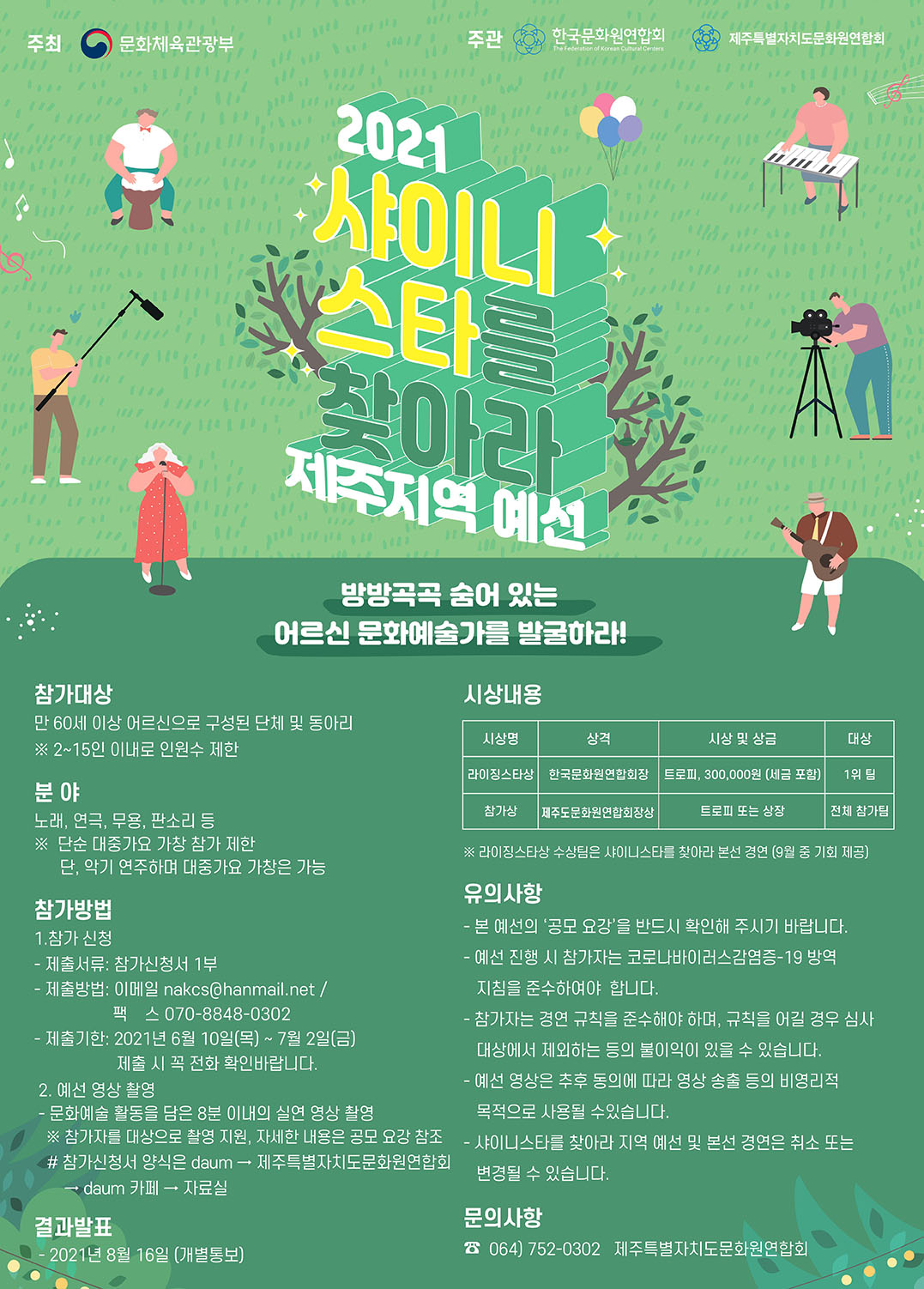 ㅇ 행사명:「2021 샤이니스타를 찾아라」제주지역 예선 ㅇ 행사기간: 2021년 6월~8월 ㅇ 참가신청서접수: 2021. 6. 10 ~ 7. 2 (신청기간 엄수) ㅇ 진행방법: 비대면 온라인 오디션 심사 ㅇ 주최/주관: 문화체육관광부/한국문화원연합회·제주도문화원연합회 2. 행사내용 ㅇ 대상: 만60세이상 어르신으로 구성된 예술활동 단체 - 50대 참여비율 30%이하로 제한 - 팀당2~15인 이내로 인원수 제한 ㅇ 모집분야: 양악, 국악, 무용, 연극 등 동아리 및 단체 ㅇ 심사방법: 팀별 지역예선 영상 촬영본을 활용한 비대면 심사 ㅇ 예선일정: - 제주시 7월 16일~17일(2일간) 영상촬영 - 서귀포시 7월 21일(1일) 영상촬영 ㅇ 문의: 제주도문화원연합회 064-752-0302, 010-3696-2895 |